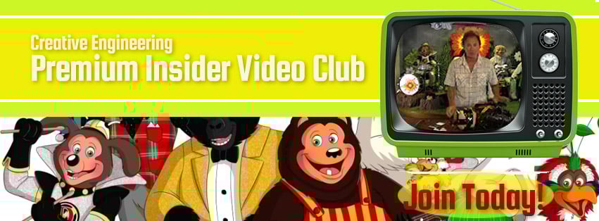 This video series will be sent to you, one video at a time for an entire year covering a large variety of subjects, projects, and inventions. The Behind The Scenes videos are very detailed, showing you almost as much as you would see if you went to Creative Engineering and hung out with Aaron Fechter every day as he and his friends, visitors and assistants work on various projects and products, including the repair of animatronic shows, development of new animatronic ideas, studio programming of The Rock-afire Explosion, studio recording sessions for The Rock-afire Explosion and anything else that happens to be going down at CEI on practically any day. You'll be right beside Aaron as he works out problems, makes great stuff, makes junk, makes history and makes mistakes. You'll get to hear Aaron read and answer his fan mail and their questions. And, you'll be able to contribute your own ideas through comments below the video about what's going on.